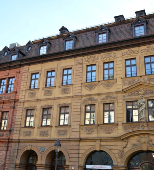 Besucher Würzburgs gezeigt wird. Es liegt an der wunderbar reichen Rokoko-Fassade mit den drei Ziergiebeln . Wirklich schön und