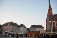 Eine sehr besondere Wallfahrtskirche mit besonderer VorgeschichteAls ich im Jahr 1987 völlig ortsfremd, unbekümmert und absolut grün hinter den Ohren zum Studium nach Würzburg kam, streifte ich natürlich auf das Heftigste interessiert durch die Domstadt und sah dabei dies und das, wovon sich ein paar markante Punkte sogleich schon einmal in meinem virtuellen Stadtplan einprägten. - Kam es nun zu ersten persönlichen Verabredungen, so mussten natürlich gerade solche Punkte bemüht werden, um sich nicht zu verpassen. Meine erste Würzburger Verabredung traf ich also am Dom, denn den konnte man ja gar nicht verfehlen, so groß und frei und dominant, wie er da auf dem Marktplatz stand ...Nun ja, solche Irrtümer brachten den 'Zugereisten' oder 'Neigeschmeckden', wie man in Franken sagt, dazu sich schleunigst ein wenig Orts- und Kulturkundig zu machen. Und eines wurde dabei schnell klar: in dieser eigentlich nicht so grossen und überschaubaren Stadt gab es weit über 40 Kirchen! Und eine der größeren dieser Kirchen ist zwar die Marienkapelle am unteren Markt, aber bei weitem natürlich nicht der Dom. Zu meiner Ehrenrettung darf ich anführen, dass ich bei weitem nicht der Einzige war und bin, dem ganz genau dieser Irrtum unterläuft. Die Marienkapelle - so leicht sie als mehrschiffige, gotische Saalkirche hoch aufragend und in den Verzierungen sowie Verstrebungen sehr freundlich erscheint - hat leider ein sehr düsteres Ereignis zur Vorgeschichte. Nein, mehr als das. Es ist das schwärzeste Kapitel der Stadt. Genau dort nämlich, wo sich heute die Kirche erhebt, stand einmal die Synagoge einer der größten jüdischen Gemeinden im deutschsprachigen Raum, und der im Herzen einer mittelalterlichen Stadt doch sehr großzügige Markt war bis kurz vor der Mitte des 14. Jahrhunderts einmal das jüdische Viertel. Den Ereignissen vorausgegangen, die schliesslich zum Bau der Kirche führten, war zunächst einmal das sogenannte "Rintfleisch-Pogrom" im Jahr 1298. Hierbei ging es nicht etwa um Fleisch, sondern um eine angebliche Hostienschändung im nahe gelegenen Röttingen. 'Rintfleisch' war der Name eines kleinen Ritters, der dort das Pogrom anführte, welches sich über die ganze Region ausbreitete. In Würzburg kamen ca. 950 Juden grausam zu Tode, ein unsägliches Gemetzel.Und dann die paneuropäische Pest 1347/48! Erst hatte ein Frost die Weinernte dezimiert und schliesslich - wie überall in Europa - also die Pest. Na klar, 'Brunnenvergiftung durch die Juden' war das rasende Gerücht, das sich flächendeckend verbreitete(selbst am Mittelmeer, wie ich durch meine Jahre in Südfrankreich weiß). - Die Würzburger Rechtfertigung des Mittelalters wollte später zunächst, dass sich die Juden der Stadt selbst verbrannt hätten, als sich die Bürger näherten sie zu geißeln. Tatsache jedoch war, dass das jüdische Viertel komplett niedergebrannt und die darin lebenden Menschen grausam vernichtet wurden. Niemand kann sagen, um wie viele es sich gehandelt haben mag. Es gab fürs erste keine Juden mehr in Würzburg.Im Nachgang wurde sozusagen zur Verarbeitung der Ereignisse eine der Jungfrau Maria geweihte Kapelle aus Holz errichtet. Diese zog rasch so viele Menschen zur Wallfahrt an, die entweder durch die persönlichen Verluste der Pest oder im Angesicht der eigenen (schrecklichen) Tat so etwas wie Trost oder Zuversicht benötigten, dass dieser Bau schon bald nicht mehr ausreichte. Da hatte der Bischof Gebhard von Schwarzenberg im Jahr 1378 eine großartige Idee. Die Bürger der Stadt sollten der Jungfrau Maria zur Buße eine neue Kirche errichten. Und das taten Sie denn auch. Im folgenden entstand mit der Marienkapelle auf dem 'Unteren Markt' ein gotischer Kirchenbau also genau über der vormals jüdischen Synagoge. Eine großartig, filigran und leicht in die Höhe aufragende Saalkirche, wie es vielleicht keine weitere Entsprechung zu ihr gibt.Die Bauzeit betrug in etwa 100 Jahre, so dass die Kirche erst um 1480 herum mit der Fertigstellung des Kapellenturms vollendet war. Nur wenige Jahre darauf werden rechts und links des seitlichen Südportals (durch welches man die Kirche heute zumeist betritt) die von dem damals noch jungen Tilman Riemenschneider geschaffenen Figuren des Adams und der Eva aufgestellt. Für die Zeit insbesondere bemerkenswert ist sicher die Nacktheit der Plastiken und auch ihre Symbolträchtigkeit, wenn man sich an die Vorgeschichte der Kirchenentstehung erinnert. An der Aussengliederung fallen vor allem die selbst für eine gotische Kirche über die komplette Mauerhöhe sehr hoch bis direkt unter das Dach gezogenen Fenster von Langhaus und Chor auf, wodurch die einzelnen Joche stark betont werden. Die Gliederung der Fenster beschränkt sich dabei auf schmale Streben sowie ein einfaches Maßwerk mit Rose im Spitzbogen. Die im Grunde auch schlanken und vielleicht daher nur wenig verblendeten Pfeiler tragen in ihrer Mitte Heiligenfiguren, ich im einzelnen leider gerade nicht zuordnen kann (Sorry, finde ich bei Gelegenheit vielleicht einmal heraus). Balustrade und mit Blendwerk versehene Pfeilerhauben schliessen den Bau zum einfachen Satteldach hin ab, welches alle drei Schiffe gleichermassen einheitlich überspannt. Nord-, West- und Südportal thematisieren in Ihren Tympanonfeldern "Maria Empfängnis", das "Weltengericht" sowie "Maria Krönung". Dabei findet sich gerade bei dem oft weniger beachteten - weil baulich vom Markt abseits gelegen - Nordportal eine sehr interessante, mittelalterliche Interpretation der Möglichkeit zur jungfräulichen Empfängnis: Gott nämlich bläst der Jungfrau durch einen Schlauch den Samen des Jesus-Kindes in das linke Ohr hinein. Sehr anschaulich.Ein wenig anachronistisch zum ansonsten filigranen Eindruck des Gesamtbaus wirkt der wuchtige, quadratisch geschlossen aufgemauerte und nur durch Scharten durchbrochene untere Teil des Glockenturms (insgesamt 70 Meter hoch) bis zur Dachhöhe neben der Westfassade. Das liegt vor allem daran, dass er 