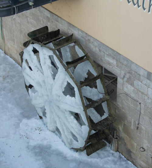 Das an dem Gebäude noch angebrachte Mühlrad soll an die ehemalige 'Untere Mainmühle' erinnern.