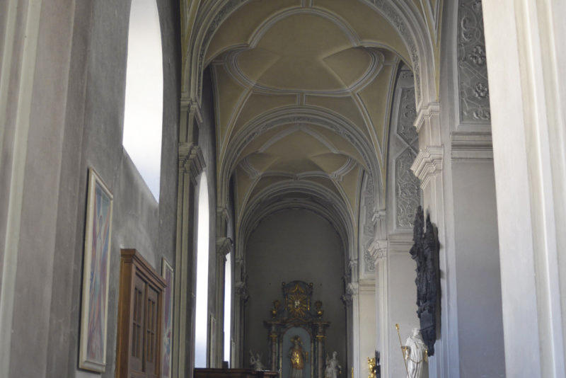 Die Pfarrkirche der südlichen AltstadtDie in ihrem Ursprung romanische Basilika am Peterplatz ist bereits spätgotisch stark umgebaut und dann Anfang des 18. Jahrhunderts barockisiert worden. Diesen Bauzustand finden wir mehr oder weniger auch heute vor; immer abgesehen von den Reduzierungen, welche die Zerstörungen des 2. Weltkrieges mit sich brachten.Erbaut wurde sie als Pfarrkirche des damals südlichen Stadtviertels wohl um die Mitte des 12. Jahrhunderts (1157). Die Besonderheit der romanischen Basilika besteht in den Emporen der Seitenschiffe. Es mag sein, dass beispielsweise die Zunftmitglieder im Hauptschiff Platz nahmen, während Einfache und Gemeine sich auf den Emporen drängten. NachWesten wurde sie durch eineZweiturmfassade abgeschlossen und im Osten wahrscheinlich durch eine Chorapsis mit Altar. Vierung und Querhaus fehlen, was natürlich mit der Funktion als Pfarrkirche zusammenhängt. - Der Chor wurde später durch einen gotischen Hochchor mit Gewölbe und Chorschranke ersetzt.Die barocken Umbauten schliesslich haben das Erscheinungsbild der einstigen Basilika vollkommen verändert. Romanisch beibehalten wurden eigentlich nur die beiden Türme im Westen, obgleich auch diese in ihren oberen Abschnitten ein barockes Aussenkleid annahmen. Zudem rückten sie sozusagen in den Bau hinein, denn die neue Fassade wurde bei diesem Umbau um ein Stück vor den bisherigen Bau gesetzt. Sie erinnert in der dreigeschossigen und auch vertikal dreifach geteilten Gliederung und dem ionisch geschwungenen Giebel ein wenig an die Fassade der Augustinerkirche, was nicht unbedingt verwundern muss, wenn man berücksichtigt, dass mit Joseph Greising hier der gleiche Architekt (jedenfalls stammen die Pläne der Augustinerfassade v. Greising) zur gleichen Zeit tätig gewesen ist. Der wichtigste Unterschied besteht in der Hauptsache darin, dass hier die Gliederungen sehr viel stärker hervortreten als an der Augustinerkirche, dass Verzierungen und die figürlichen Einlassungen umfangreicher sind, und - last, not least - der Mittelteil der Fassade als Risalit und konvex geschwungen hervortritt.Entsprechend diesem Konzept treten rund herum die Nord- und Südwand sowie auch der ansonsten gotisch belassene Chor in der Aussengliederung auf.Auch im Innenraum das gleiche Bild. Barocker Stuck und Verzierungen, Bilder, Figuren und so weiter. Vieles ist leider, leider auch hier natürlich zerstört worden und für immer verloren. Sehenswert sind vor allem die Kanzel von Johann Wolfgang van der Auwera und der Stuck von Antonio Bossi um 1745 herum. All dieses war zwar auch stark in Mitleidenschaft gezogen, konnte aber anhand der geretteten Einzelteile authentisch rekonstruiert werden. Sehenswert vielleicht auch die Säulenkonstruktion des Hochaltars im Chor.St. Peter und Paul ist eine schöne und aufgrund der Leistung Greisings wirklich durchdachte Kirche, welche durch ein gewisses Überangebot in unseren Tagen jedoch ein eher weniger frequentiertes Dasein fristete. Von daher bestanden Überlegungen für einezukünftig durchaus andere Nutzung denn als Pfarrkirche. Dies hätte beispielsweise als Beisetzungsstätte für Urnen sein können. Ich persönlich fand das ein sehr interessantes und für das Gedenken auch sehr würdiges Konzept.Schließlich kam es jedoch anders, in dem der Kircheninnenraum vollständig saniert und in weiten Teilen auch neu gestaltet wurde. Nach 16 Monaten Bauzeit wurde St. Peter und Paul als Pfarrkirche im November 2016 wiedereröffnet, so dass 2017 hier nunmehr die Erinnerung an das Martyrium des Hl. Aquilin (in Mailand vor 1018) begangen werden konnte, welcher gebürtig aus dem Würzburger Peterviertel und damit mehr oder weniger der heutigen Pfarrgemeinde St. Peter und Paul entstammte, hätte es diese zu seinen Lebzeiten schon gegeben.‘St. Peter und Paul’ im Video das AltstadtrundgangesDie Station 12 des Altstadtrundganges führt u.a. auch zu der Pfarrkirche ‘St. Peter und Paul’ im gleichnamigen Peterviertel. Sehen Sie hier das entsprechende Kapitel aus dem Video des Rundganges, das Sie sich auf Mein-Wuerzburg.com in voller Länge auch auf der zuständigen Seite Altstadtrundgang anschauen können.