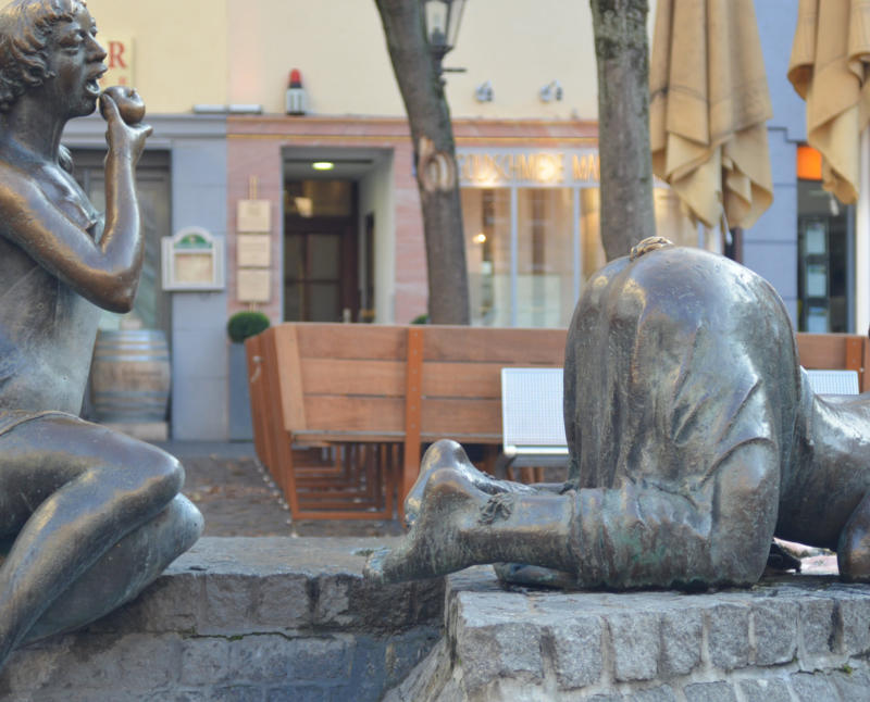 Für junge Kinder das Highlight beim Einkauf in der CityNachdem der Sternplatz sehr früh schon gegen Ende des 14. Jahrhunderts wahrscheinlich aus hygienischen Gründen für den dortigen Handel mit Fischen, Geflügel und anderen Lebensmitteln gepflastert worden war, installierte man dort zur gleichen Zeit auch einen öffentlichen Ziehbrunnen. Später - die Domstrasse und der Sternplatz waren längst kein Marktort mehr - folgte ein grosser barocker Zierbrunnen, der sogenannte "Vier-Eimer-Brunnen". Dieser war in Aufbau und Gestaltung dem 'Vierröhrenbrunnen' gegenüber dem 'Grafeneckart' recht ähnlich. Um 1860 herum wurde dieser 'Vier-Eimer-Brunnen' jedoch ersatzlos wieder abgebrochen, da man zu jener Zeit bemüht war, in der Enge der Altstadt neue Räume zu schaffen. Dies war damals gewissermaßen ein Reflex der Würzburger gegen die jahrhundertelange Enge und Begrenzung als Festungsstadt.Als die Domstrasse Ende der 1980er Jahre Fußgängerzone wurde - man stelle sich nur einmal vor, gegen diese Maßnahme gab es seinerzeit tatsächlich eine organisierte Kampagne ansässiger Einzelhändler (!!) - wurde der bis dahin überwiegend als Parkplatz genutzte Sternplatz neu gestaltet, und in diesem Kontext entstand auch wieder ein Brunnen.Dieser neue, von dem Künstler Lothar Forster geschaffene Brunnen verfolgt zwar moderne Ideen, versucht aber nicht, diese in Designerformen auszudrücken, sondern vielmehr in Bezügen zur Platzgeschichte und zu Würzburg passenden Motiven.Da ist zunächst einmal die Sternform des Brunnenbeckens, welche an den Namen des Ortes erinnert bzw. ihn für alle sichtbar ausdrückt. Dieses mit Pflasterung versehene Becken scheint sich mit seinen 7 (!) Zacken einfach aus dem umgebenden Boden von selbst heraus gehoben zu haben. Von der Spitze jeder Sternzacke aus verläuft die Pflasterung wie ein Strahl über den Platz.Im Becken selbst wird das aufgewühlte Wasser von einer entsprechend geformten Platte aus verschiedenfarbigem, überwiegend jedoch blassrosa Marmorstein symbolisiert, es könnten Seerosenblätter darauf schwimmen. Mehrere kleine Fontänen drücken dies aus und verstärken den Eindruck. Auf einer stilisierten Halbinsel aus Kieseln zappelt eine gerade aus dem Wasser geholte Bronze-Gruppe aus 'Meefischen' auf dem Trockenen, darunter auch einer mit den Hörnern eines Bockes. Sie fungieren als Wassserspeier und erinnern an den früheren Fischmarkt auf dem Platz. Gegenüber treibt ein bronzener Faun sein Spiel. Gerade hat er kniend aus dem Brunnen getrunken, dabei sein Hinterteil grotesk vor den auf der Domstrasse wandelnden Menschen in die Höhe gereckt und äfft nun mit einem Wasserstrahl die speienden Fische nach, wobei es natürlich auch umgekehrt sein könnte. Der gehörnte Fisch mit dem Bockskopf ist schließlich auch ein Fabelwesen. Auf einem weiteren Sternzacken sitzt Nymphe ganz entspannt, beobachtet amüsiert das bunte Treiben und ist gerade im Begriff beherzt in einen Apfel zu beißen. - Es heißt, dass die Figur der Nymphe nach den Zügen der Tochter des leider nur wenige Jahre darauf mit noch nicht einmal 60 Jahren verstorbenen Künstlers trage. Etwas abseits neben den Bänken befindet sich bei den Erholungsbänken auf einem Sockel ein ebenfalls von Lother Forster geschaffener und zum Gesamtkonzept gehörender Wasserspender mit Bronzefisch für die tatsächliche Erfrischung auf Knopfdruck.Der Sternbrunnen erfreut sich insbesondere bei Familien mit Kindern grosser Beliebtheit und das zu Recht. Den Kleinen macht der kecke Faun und die ganze Anfassbarkeit der Anlage zusammen mit dem Wasser natürlich grossen Spass.Der ‘Sternbrunnen’ im Video des AltstadtrundgangesDie Station 10 des Altstadtrundganges behandelt rund um die Domstrasse im Rahmen der Geschichte des Sternplatzes insbesondere auch den heutigen ‘Sternbrunnen’. Sehen Sie hier das entsprechende Kapitel aus dem Video des Rundganges, das Sie sich auf Mein-Wuerzburg.com in voller Länge auch auf der zuständigen Seite Altstadtrundgang anschauen können.