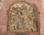 versorgt wurde, dem die Figur des Samson das Maul aufhält. Zu beiden Seiten daneben weitere Reliefs, welche die Figuren